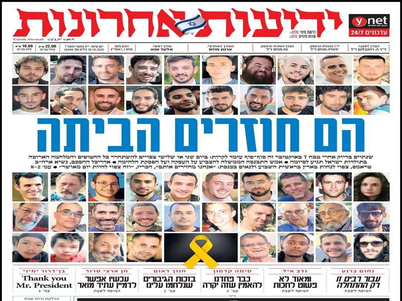 تصدر عنوان "إنهم يعودون" الصفحة الأولى من صحيفة "يديعوت أحرونوت" العبرية، في إشارة إلى عودة جنود الاحتلال إلى مواقعهم بعد إعلان اتفاق وقف العدوان وخوض الحرب مع المقاومة الفلسطينية في قطاع غزة.