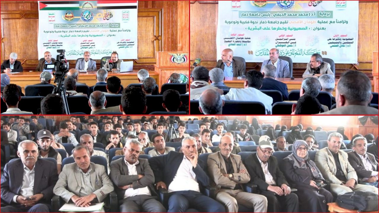 ذمار | المسيرة نت: تواصلاً مع الحراك الشعبي والفكري المتنامي في اليمن، وفي سياق المواقف الوطنية الراسخة الداعمة للقضية الفلسطينية، نظمت جامعة ذمار ندوة علمية ثقافية بعنوان "الصهيونية وخطرها على البشرية"، هدفت إلى تعرية المشروع الصهيوني وكشف طبيعته العدوانية ومخاطره على القيم الإنسانية، واستعراض الرؤية القرآنية لممارساته الاستعمارية، والتأكيد على أن الوعي والفكر يشكّلان خط الدفاع الأول في مواجهة هذا الكيان.