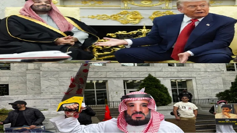 المسيرة نت| خاص: شهدت العاصمة الأمريكية واشنطن لقاءً مثيرًا للجدل بين الرئيس الأمريكي ترامب وولي العهد السعودي محمد بن سلمان، حيث تداخلت مشاهد الاستقبال الرسمية الصاخبة في الخارج، مع نقاشات ذات طابع هجين جمع بين قاعة المحاكمة، والبازار الاقتصادي في الداخل.-
