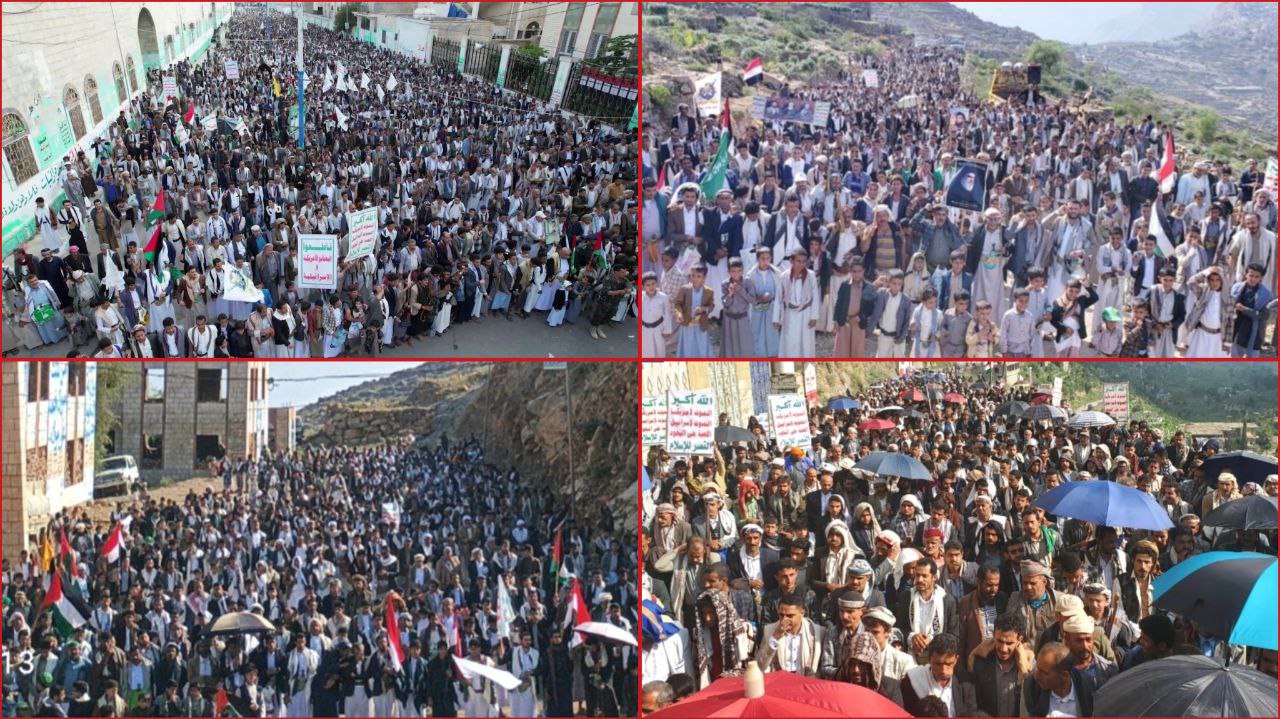 حجة | المسيرة نت: احتضنت محافظة حجة اليوم حشوداً جماهيرية واسعة غفيرة في 335 على امتداد كافة المديريات والعزل، تحت شعارٍ "طوفان الأقصى.. عامان من الجهاد والتضحية حتى النصر"، في تجلٍّ بارز لوحدة الموقف الشعبي والتصميم الراسخ على مواصلة الإسناد والمقاومة حتى تحقيق الهدف.