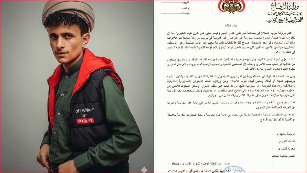 صنعاء | المسيرة نت: أدانت اللجنة الوطنية لشؤون الأسرى، اليوم السبت، الجريمة البشعة التي أقدم عليها مرتزقة حزب "الإصلاح" في محافظة تعز، والمتمثلة في إعدام الأسير عيسى مقبل العفيري، الخميس الماضي، بعد محاكمة صورية وتلفيق تهم كيدية.