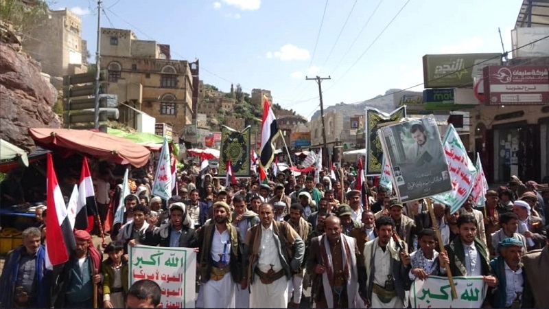المشاركون في المسيرات العلمين اليمني والفلسطيني، مرددين الهتافات المنددة بجرائم