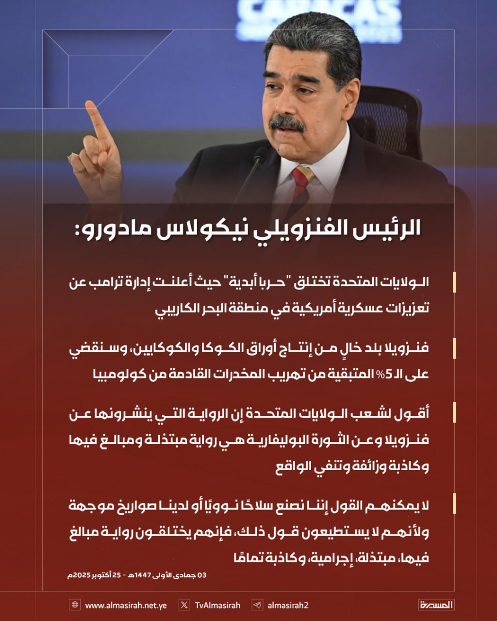 وقال مادورو إن الولايات المتحدة "تختلق حرباً أبدية ضد بلاده، مشيراً إلى أن واشنطن تنشر رواية مبتذلة ومبالغ فيها وكاذبة وزائفة وتنفي الواقع حول فنزويلا والثورة البوليفارية.
