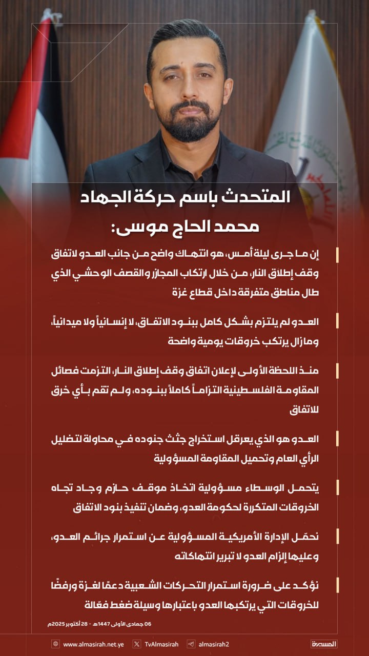 أكد الناطق الإعلامي باسم حركة الجهاد الإسلامي في فلسطين، محمد الحاج موسى، أن ما جرى ليلة أمس يعد انتهاكاً واضحاً من قبل الاحتلال الصهيوني لاتفاق وقف العدوان، من خلال ارتكاب المجازر والقصف الوحشي لمناطق متفرقة داخل قطاع غزة، لا سيما استهداف خيام النازحين.