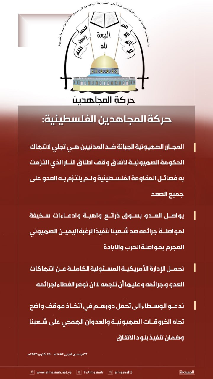 قالت حركة المجاهدين الفلسطينية إن المجازر الصهيونية الجبانة ضد المدنيين تمثّل تجلّياً واضحاً لانتهاك الاحتلال اتفاق وقف إطلاق النار، مؤكدة أن فصائل المقاومة التزمت ببنود الاتفاق بينما لم يلتزم العدو على كافة الصعد.
