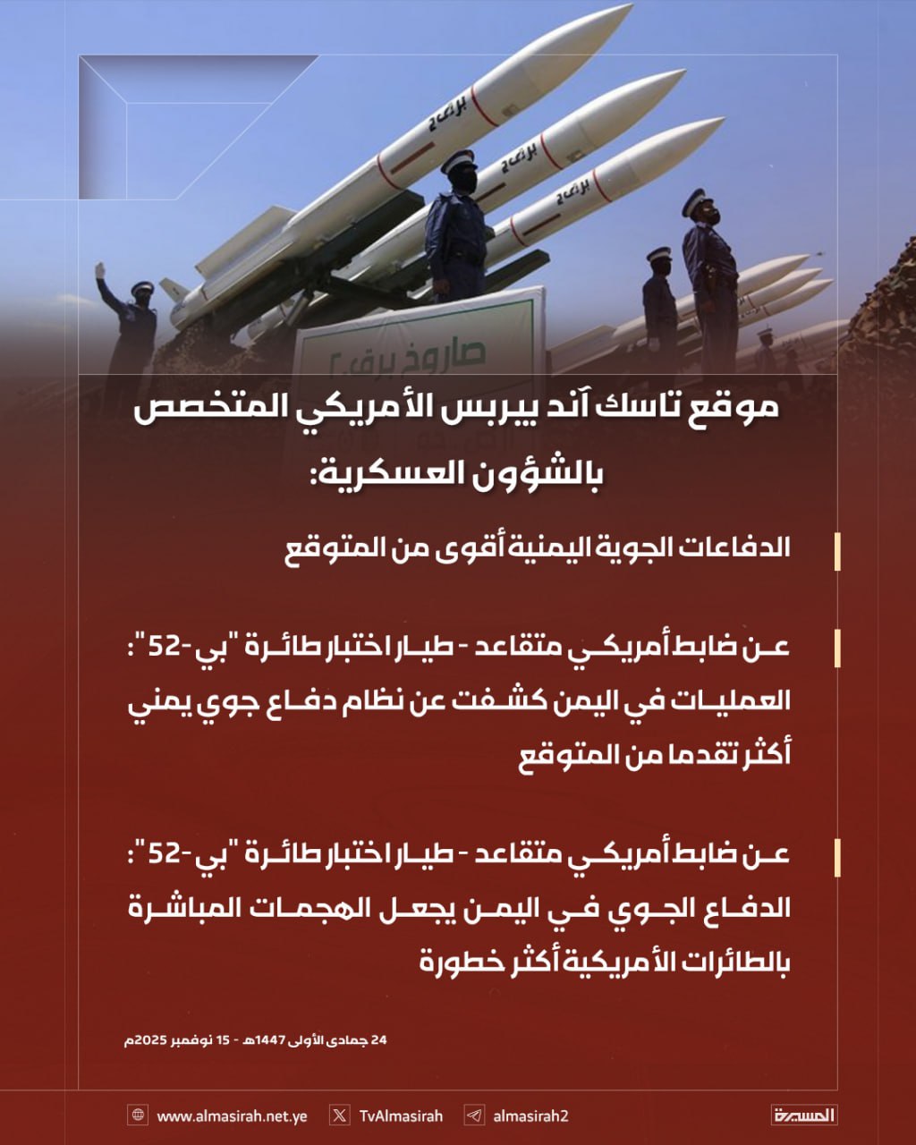 كشف موقع "تاسك آند بيربس" الأمريكي المتخصص في الشؤون العسكرية عن تقديرات جديدة داخل الأوساط الدفاعية الأمريكية، تشير إلى أن منظومات الدفاع الجوي اليمنية باتت أكثر تطوراً وقوة مما كان متوقعاً لدى البنتاغون.-
