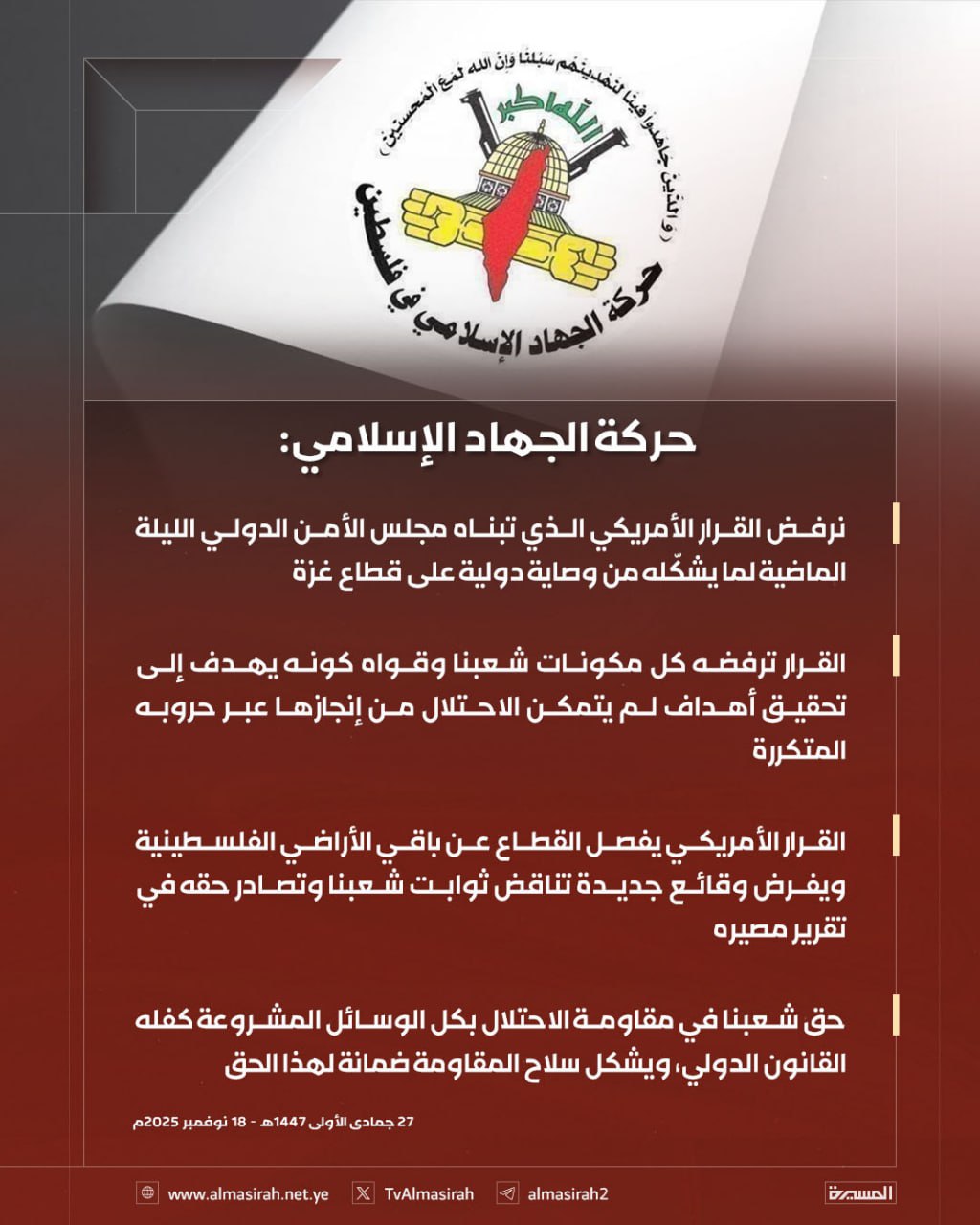 رفضت حركة الجهاد الإسلامي القرار الأمريكي الذي تبناه مجلس الأمن الدولي الليلة الماضية بشأن قطاع غزة، معتبرة أنه يشكّل وصاية دولية مفروضة على الشعب الفلسطيني، ويمثل امتداداً لمحاولات الهيمنة الأمريكية على القرار الوطني الفلسطيني.