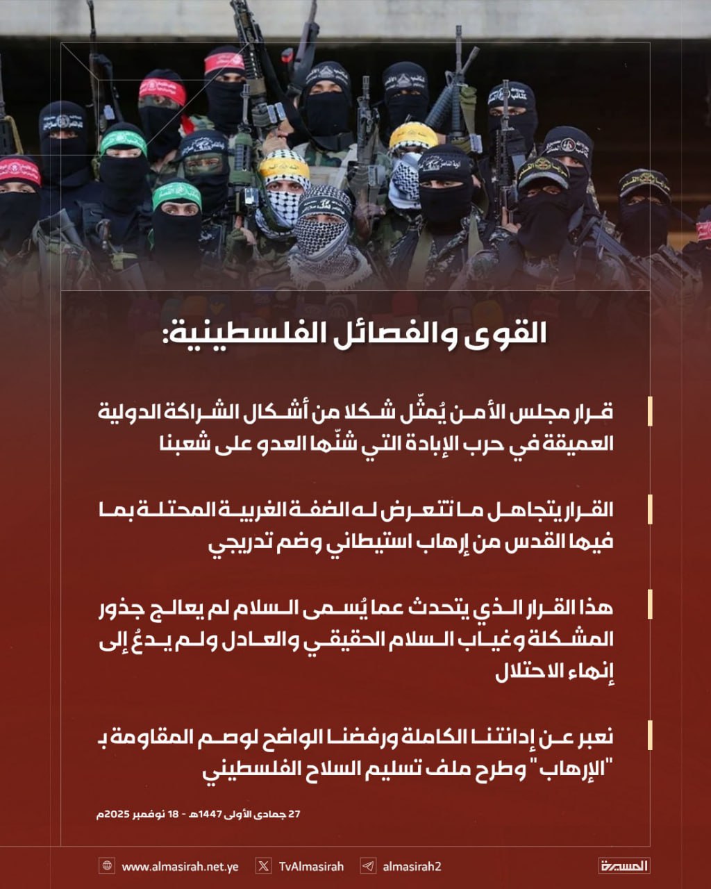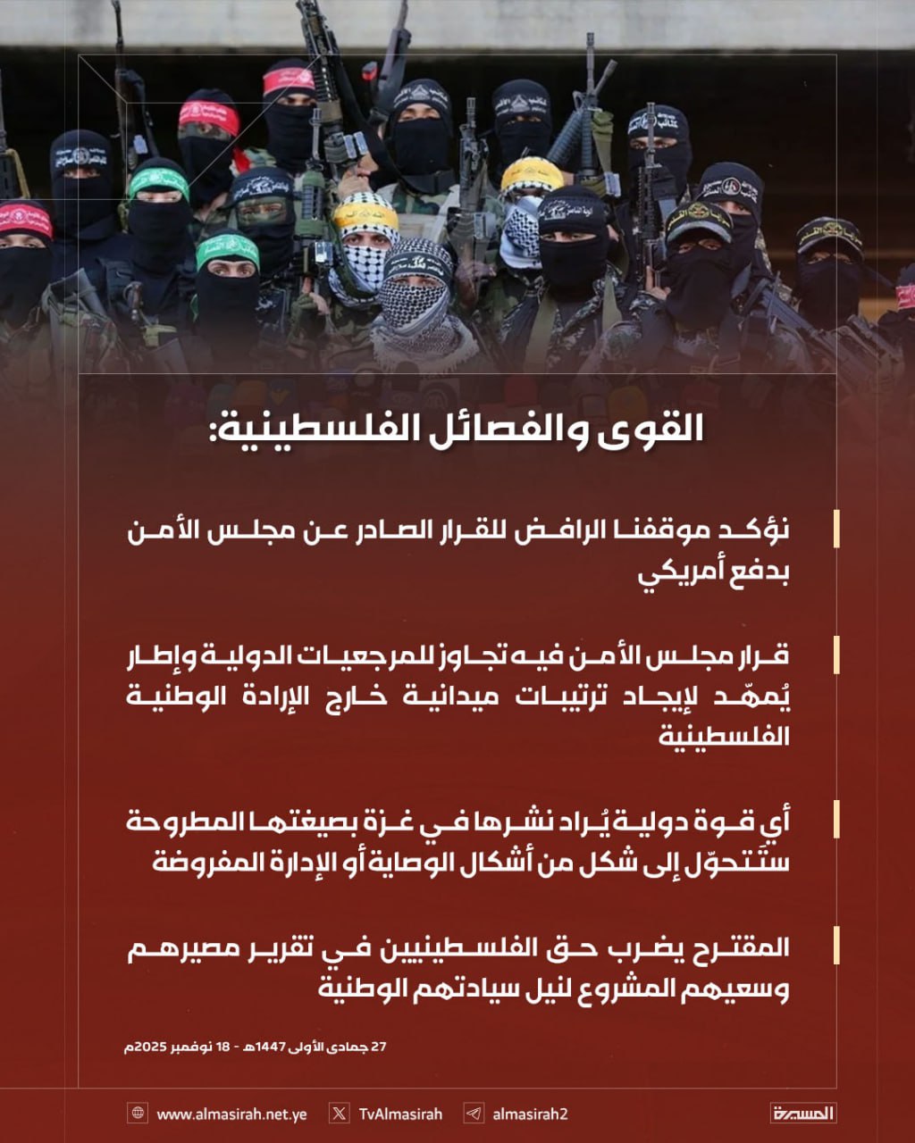 جدّدت القوى والفصائل الفلسطينية موقفها الرافض للقرار الذي أصدره مجلس الأمن الدولي بدفع وضغط أميركي، مؤكدة أن القرار يشكل تدخلاً سافراً في الشأن الفلسطيني ومحاولة لفرض ترتيبات قسرية لا تمت بصلة للإرادة الوطنية الفلسطينية.