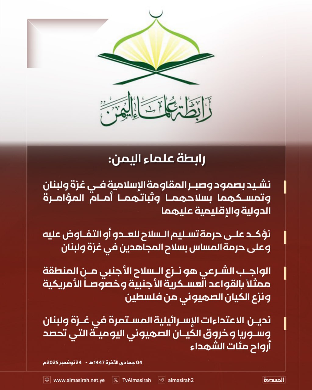 أكدت رابطة علماء اليمن على وقوفها الراسخ إلى جانب المقاومة الإسلامية في غزة ولبنان، ومساندتها للثبات والصمود الذي يبديه المجاهدون رغم حجم المؤامرة الدولية والإقليمية التي تستهدف إرادتهم وسلاحهم.