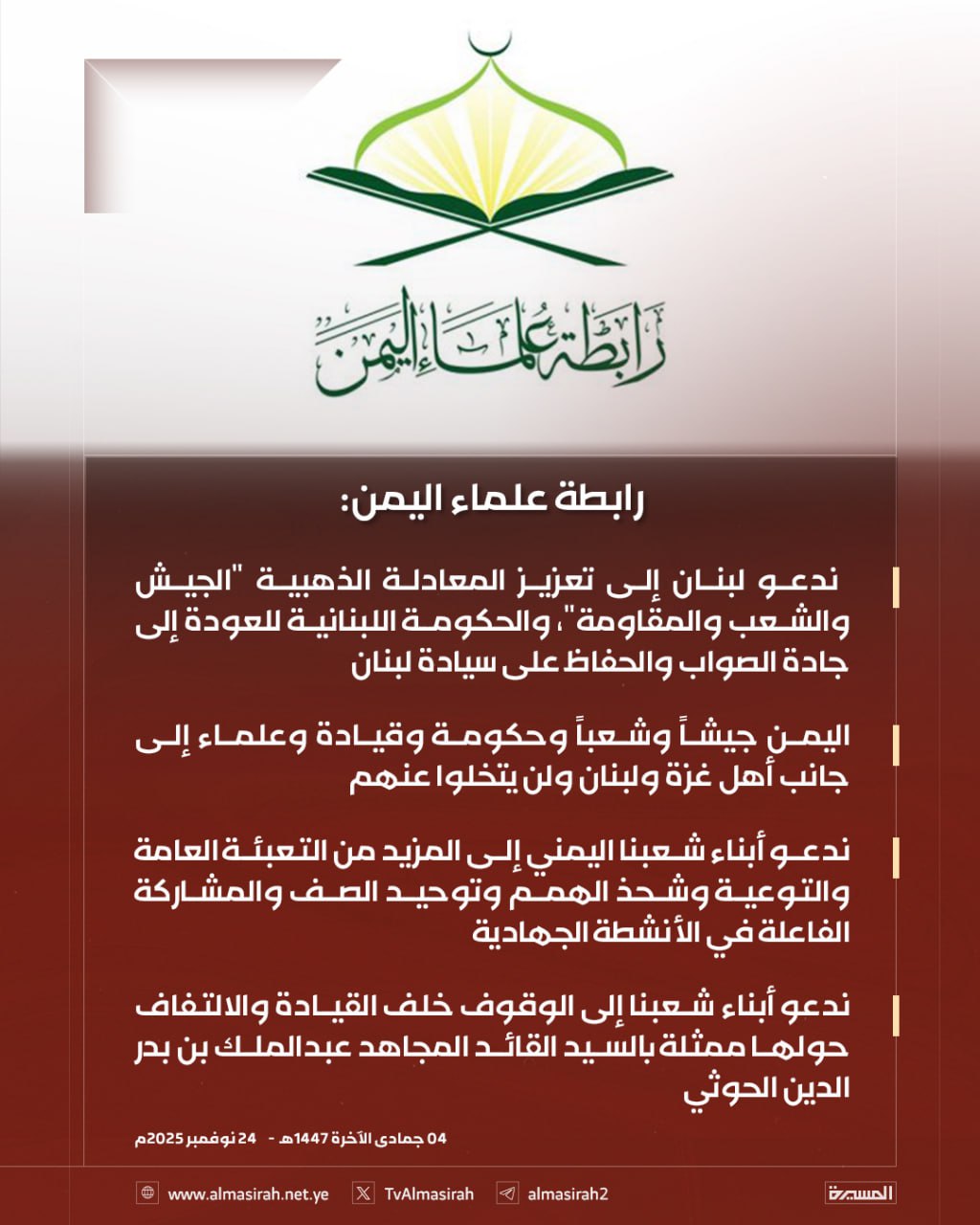 13:37رابطة علماء اليمن: ندعو أبناء شعبنا اليمني إلى المزيد من التعبئة العامة والتوعية وشحذ الهمم وتوحيد الصف والمشاركة الفاعلة في الأنشطة الجهادية