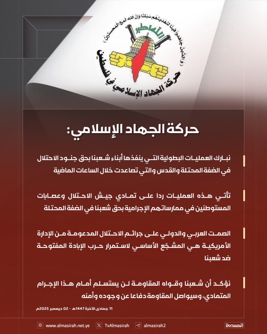 حركة الجهاد تبارك العمليات البطولية بحق العدو الصهيوني في الضفة المحتلة والقدس