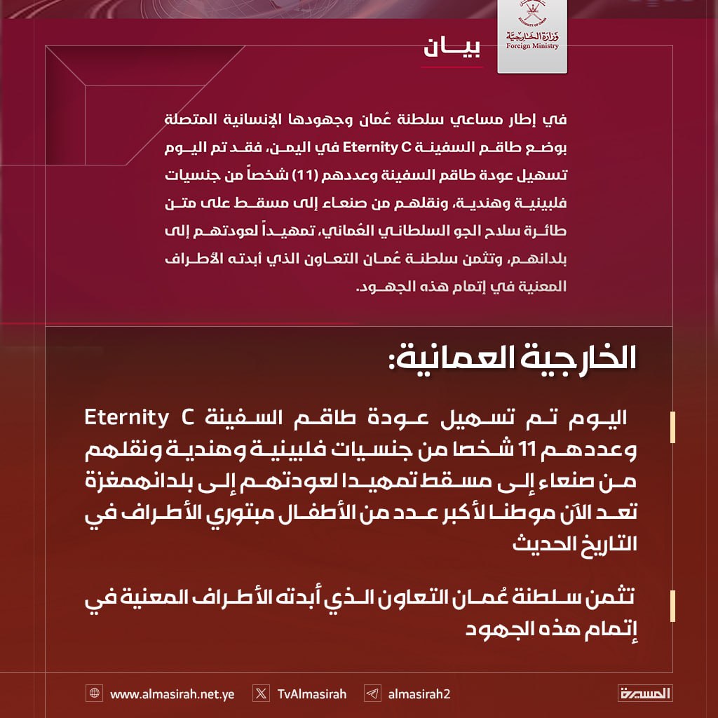 أعلنت وزارة الخارجية العُمانية، أنها قامت بتسهيل عودة طاقم السفينة Eternity C المكوّن من 11 شخصًا يحملون جنسيات فلبينية وهندية، وذلك بعد نقلهم من صنعاء إلى مسقط، تمهيدًا لعودتهم إلى بلدانهم.
