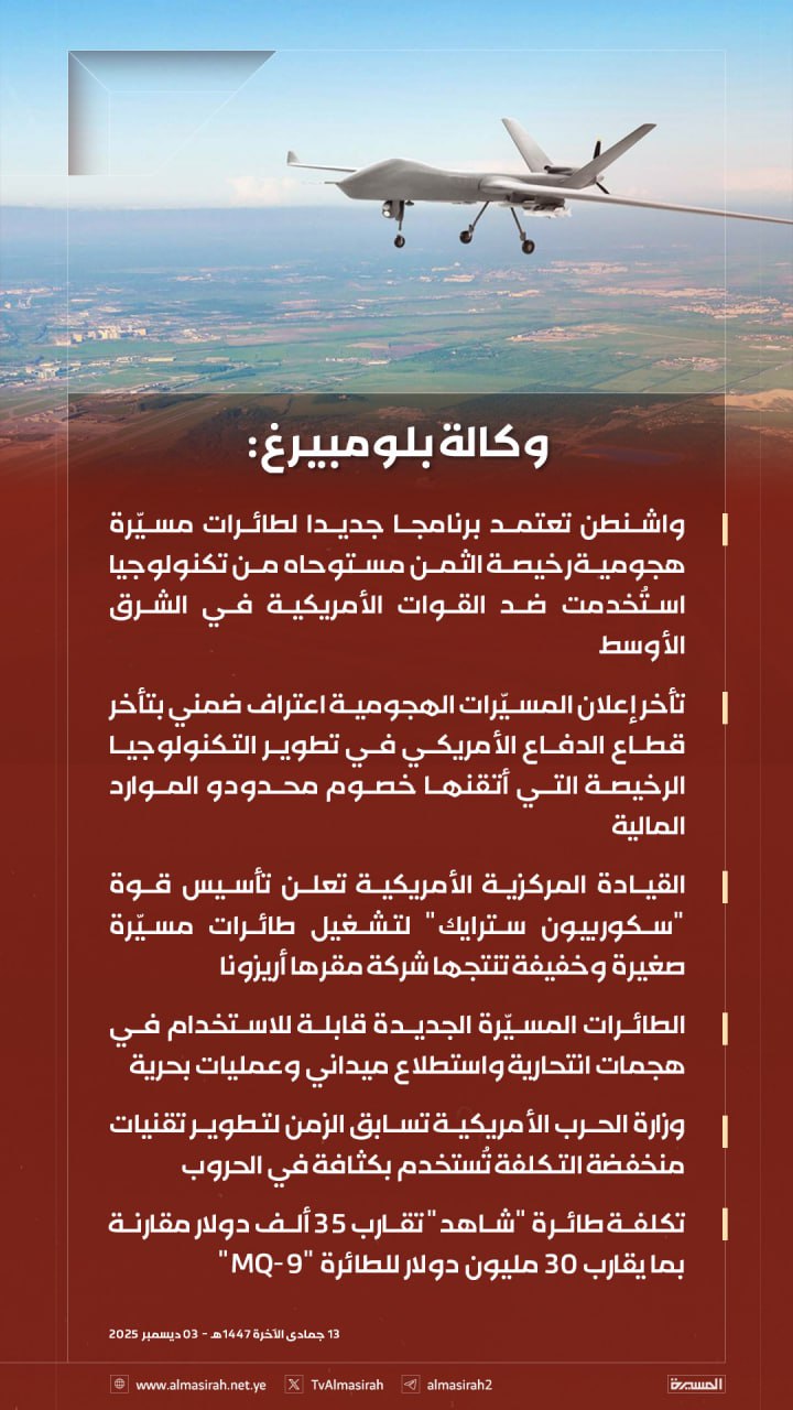 أفادت وكالة "بلومبيرغ" الأمريكية أن واشنطن اعتمدت برنامجًا جديدًا لتطوير واستخدام طائرات مسيّرة هجومية رخيصة الثمن، مشيرة إلى أن هذه التكنولوجيا مستوحاة بشكل مباشر من التقنيات التي استخدمت ضد القوات الأمريكية في المنطقة.