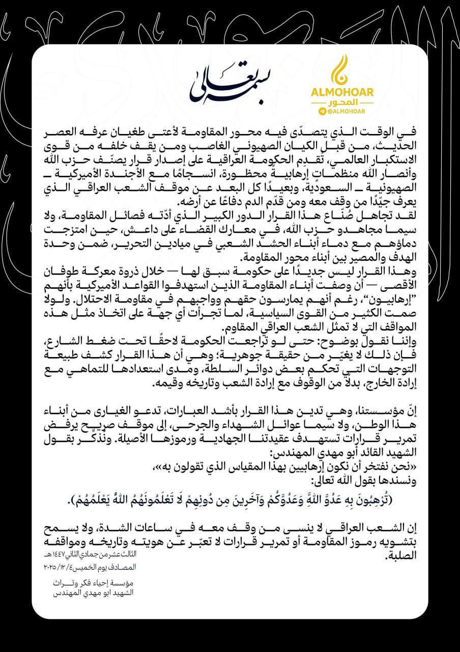 وانتقدت المؤسسة في بيان لها اليوم القرار الحكومي الأخير الذي اعتبرته متماهياً مع “الأجندة الأمريكية – الصهيونية – السعودية”، ورأت أن القرار يشكل إضعافاً مباشراً لجبهة المقاومة في ظرف إقليمي حساس، مؤكدة أن الحكومة تجاهلت التضحيات الجسيمة التي قدّمتها فصائل المقاومة والحشد الشعبي دفاعاً عن البلاد، وتغافلت عن الدور الذي لعبته تلك القوى في حماية العراق وترسيخ قواعد التحرير.