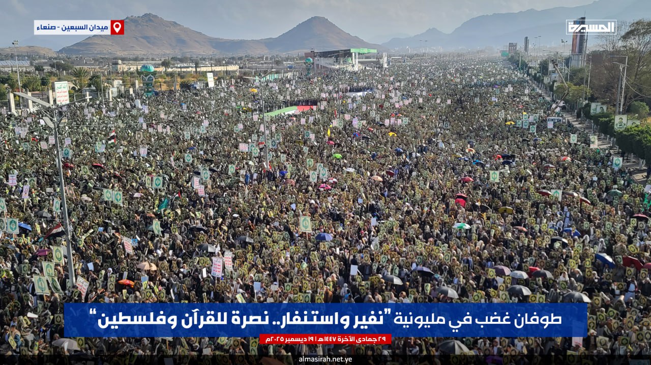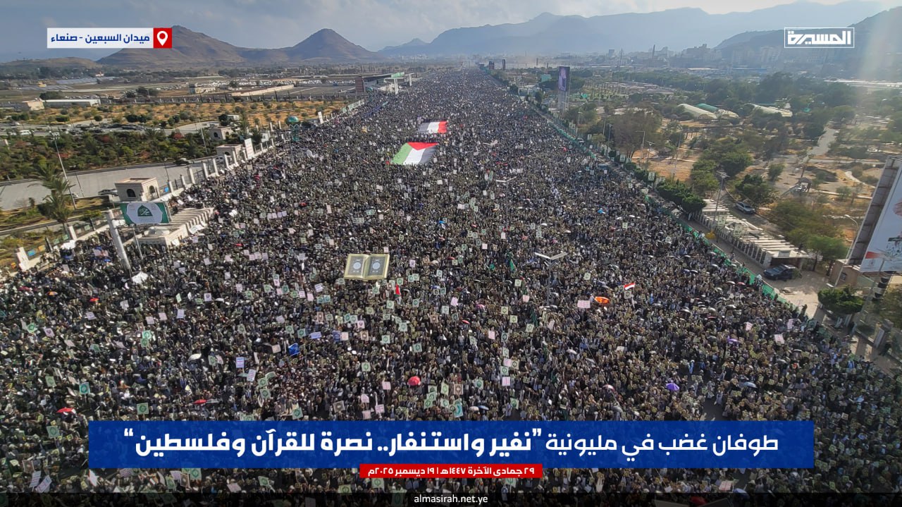 صنعاء.. خروج مليوني حاشد بميدان السبعين في مسيرة "نفير واستنفار.. نصرة للقرآن وفلسطين"