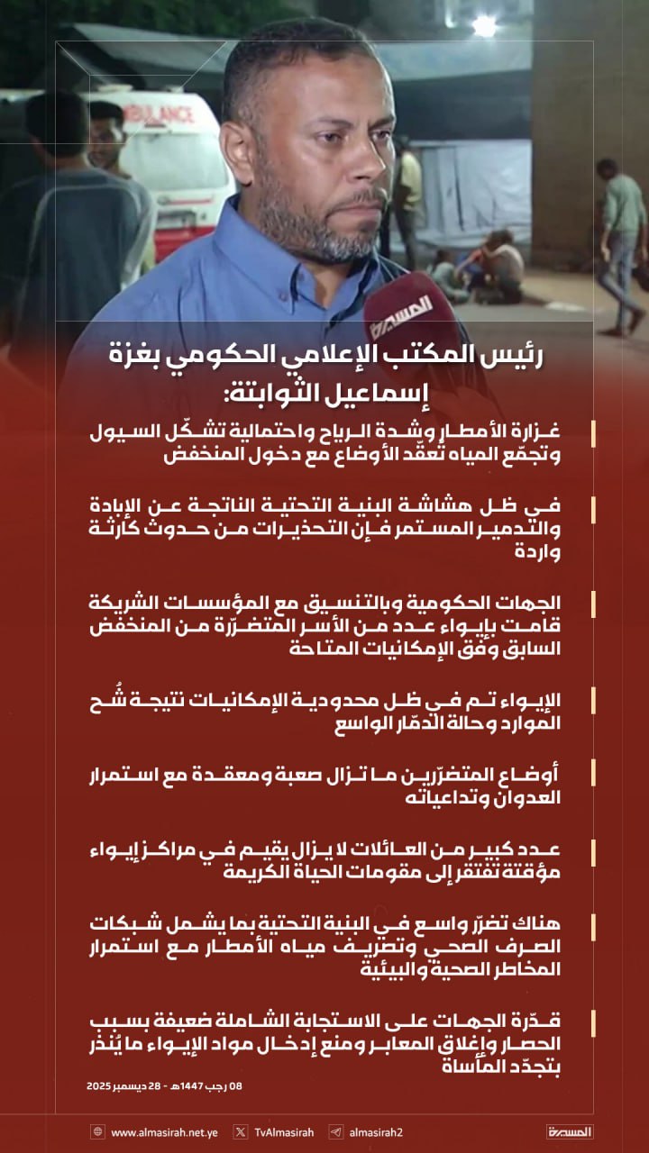 وأوضح الثوابتة في تصريح صحفي اليوم الأحد، أن هذه الظروف الجوية القاسية تأتي في وقت تعاني فيه غزة من هشاشة شديدة في البنية التحتية، نتيجة الإبادة الجماعية والتدمير المستمر الذي ينفذه العدو الصهيوني، ما يجعل التحذيرات من وقوع كارثة إنسانية أمراً وارداً وبقوة.