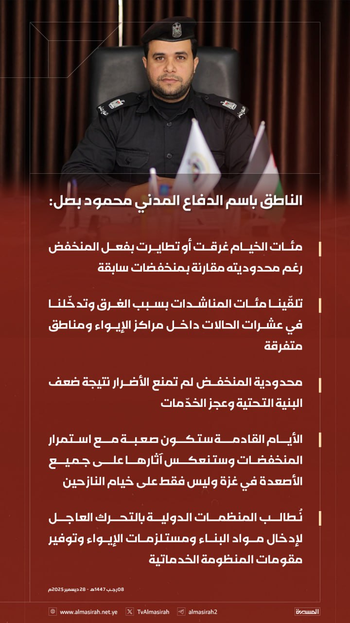 وأوضح بصل في تصريح اليوم الأحد، أن طواقم الدفاع المدني تلقت مئات المناشدات من المواطنين والنازحين بسبب غرق الخيام وتجمع مياه الأمطار، مشيراً إلى أن الطواقم تدخلت في عشرات الحالات الطارئة داخل مراكز الإيواء وفي مناطق متفرقة من القطاع، في ظل إمكانيات محدودة وضغط ميداني كبير.