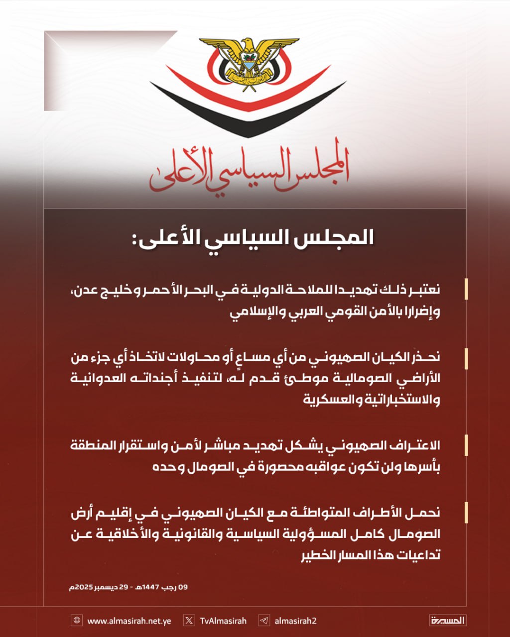 أدان المجلس السياسي الأعلى بأشد العبارات إعلان العدو الصهيوني الاعتراف بإقليم "أرض الصومال" كيانًا منفصلًا عن جمهورية الصومال الفيدرالية، واعتبره خطوة عدوانية سافرة وانتهاكًا صارخًا لسيادة ووحدة الصومال، وتدخلًا مرفوضًا في شؤونه الداخلية، يأتي ضمن مخطط توسعي يستهدف زعزعة أمن واستقرار المنطقة العربية والإفريقية برمتها.