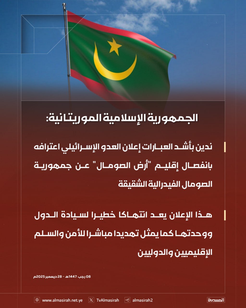 في موقف عربي وإسلامي متقدم، أدانت الجمهورية الإسلامية الموريتانية بأشد العبارات إقدام العدو الصهيوني على الاعتراف بانفصال إقليم "أرض الصومال" عن جمهورية الصومال الفيدرالية الشقيقة، معتبرةً هذه الخطوة جريمة سياسية وقانونية تستهدف تمزيق وحدة الصف الإسلامي في القارة الأفريقية.