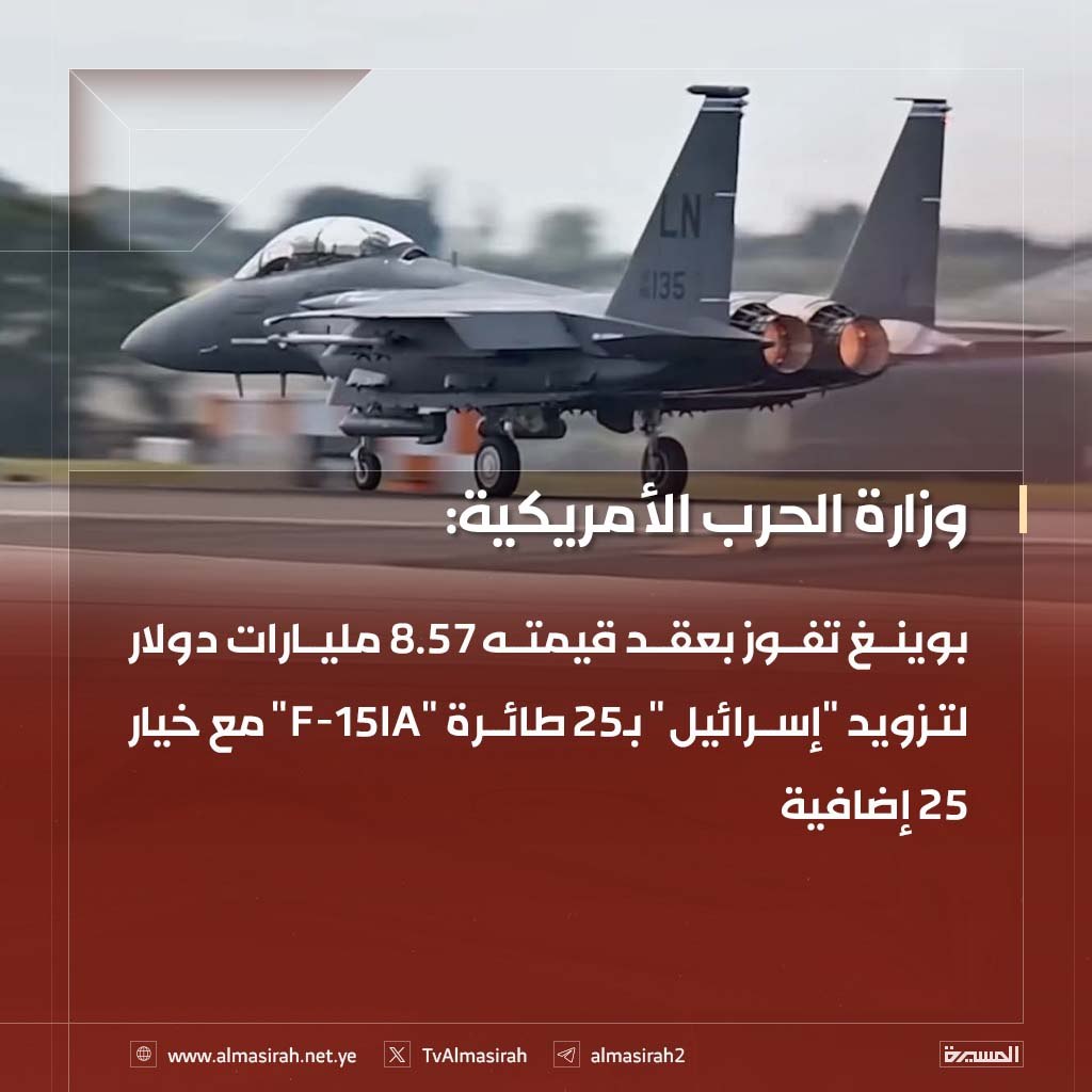 أعلنت شركة بوينغ الأمريكية فوزها بعقد عسكري ضخم بقيمة 8.57 مليارات دولار، لتزويد العدو الصهيوني بـ25 طائرة مقاتلة من طراز F-15IA، مع خيار مستقبلي يسمح بزيادة العدد إلى 50 طائرة، في خطوة تؤكد استمرار الدعم العسكري الأمريكي المفتوح لكيان الاحتلال.