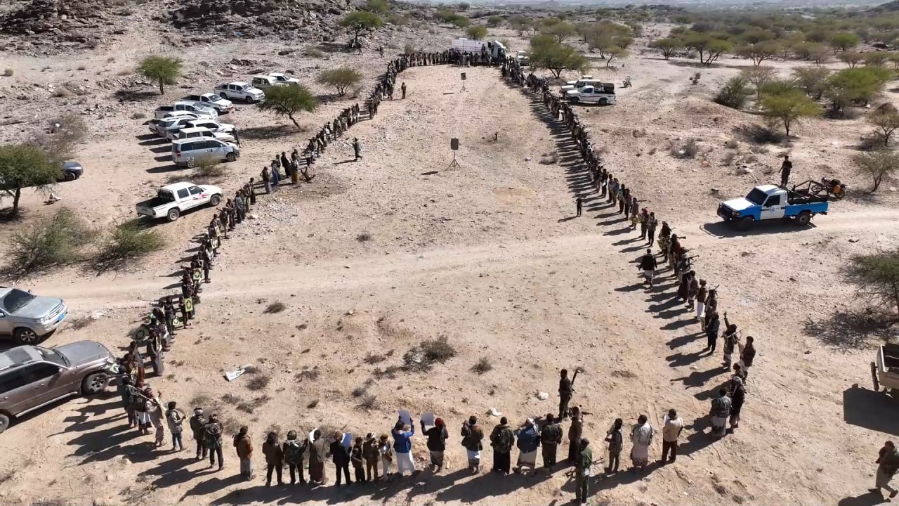 المسيرة نت| البيضاء: خرج مشايخ ووجهاء وأبناء قبائل مديرية الشرية بمحافظة البيضاء، اليوم، في وقفة قبلية مسلحة حاشدة، وغاضبة، تجديداً للنفير العام، وتأكيدًا على الجهوزية العالية والاستعداد الكامل لخوض جولة الصراع القادمة ضد الأعداء، وتأييدًا لكافة قرارات السيد القائد عبد الملك بدرالدين الحوثي _ يحفظه الله_ في مواجهة مؤامرة العدو الإسرائيلي بالصومال، وتوسيع مشروع الاستباحة في المنطقة.