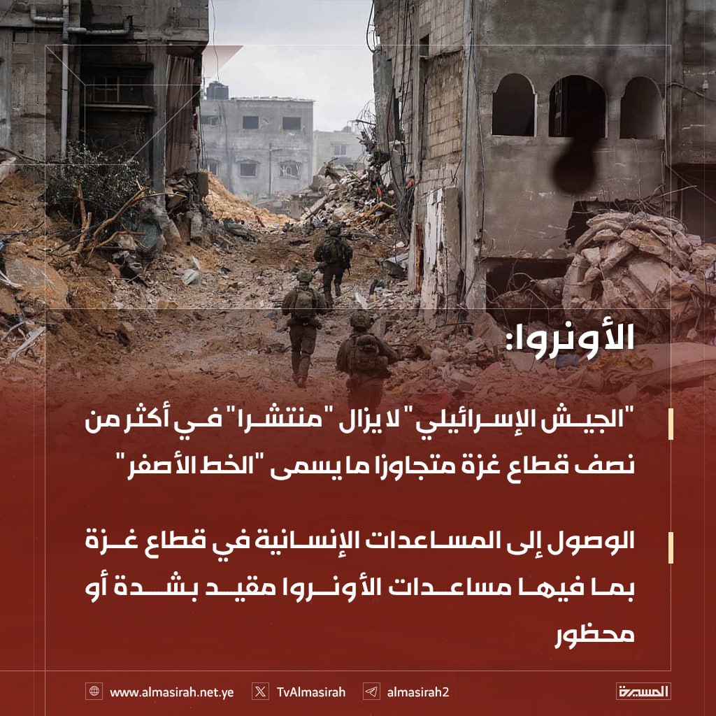 أفادت وكالة الأمم المتحدة لغوث وتشغيل اللاجئين الفلسطينيين (الأونروا) أن قوات العدو الصهيوني لا تزال منتشرة في أكثر من نصف مساحة قطاع غزة، متجاوزة ما يُسمى بـ"الخط الأصفر"، الذي لا يزال غير محدد بشكل واضح على الأرض، في استمرار واضح لسياسة السيطرة الميدانية وفرض الأمر الواقع بالقوة.