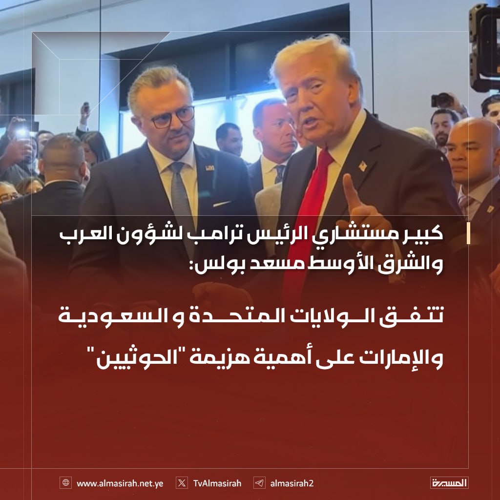 كشف كبير مستشاري الرئيس الأمريكي دونالد ترامب، لشؤون العرب والشرق الأوسط، مسعد بولس، عن توافق الولايات المتحدة والسعودية والإمارات على ما وصفه بـ"أهمية هزيمة اليمنيين"، في تصريح يعكس استمرار النهج العدائي الأمريكي المدعوم من الرياض وأبو ظبي تجاه اليمن، رغم الفشل المتراكم لكل محاولات الإخضاع العسكري والسياسي خلال السنوات الماضية.