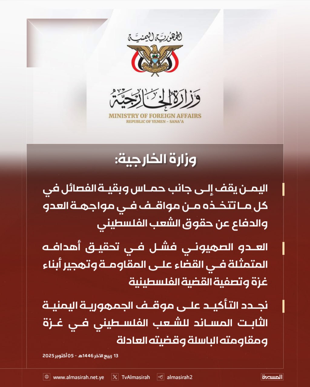 بالتأكيد على موقف الجمهورية اليمنية الثابت والمبدئي الداعم للشعب الفلسطيني