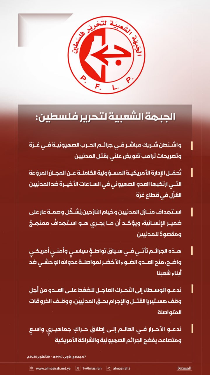 الوصف:حملت الجبهة الشعبية لتحرير فلسطين الإدارة الأمريكية المسؤولية الكاملة عن المجازر التي ارتكبها الاحتلال الصهيوني ضد المدنيين العزل في قطاع غزة خلال الساعات الأخيرة، معتبرة أن تصريحات الرئيس الأمريكي، المجرم ترامب تمثل تفويضًا علنيًا بقتل المدنيين.