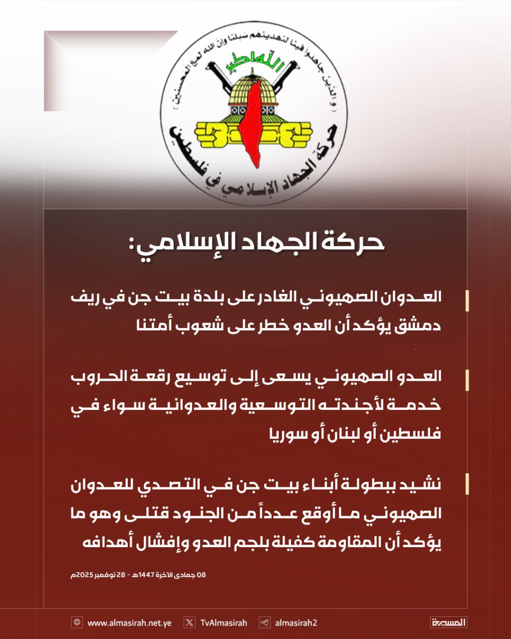 العنوان:الجهاد الإسلامي: العدوان الصهيوني على بلدة بيت جن يثبت أن الكيان خطر على شعوب الأمة